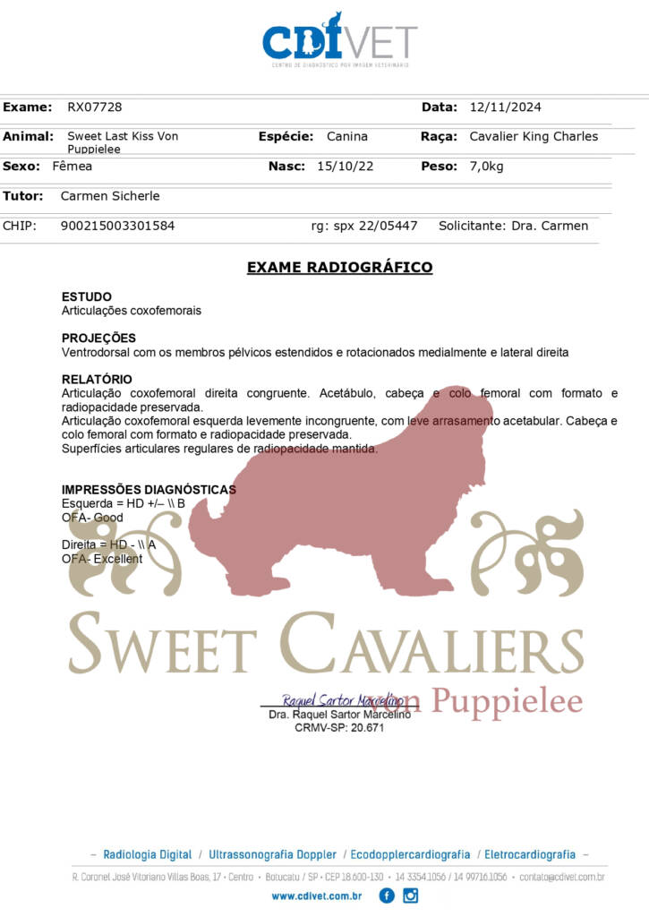 Exame de DNA negativo para Dry eye, Curl Coat e Episodic Falling. Exame cardíaco (ecocardiograma) anual. Exame oftalmológico e patela.